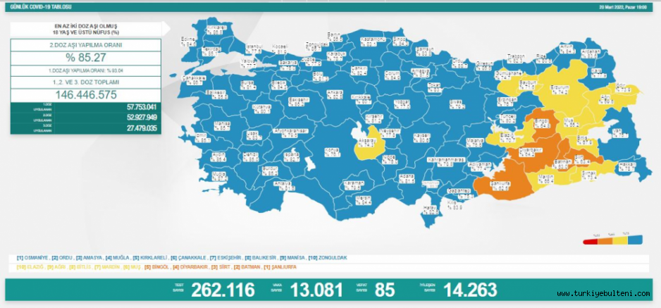 Virüs nedeniyle hayatını kaybedenlerin sayısı 85 oldu. Bir günde toplam 262 bin 116 test yapılırken, iyileşen hasta sayısı 14 bin 263 olarak kaydedildi. Sağlık Bakanlığı tarafından açıklanan tabloda, 2 doz aşılama verilerine de yer verildi. En az 2 doz aşı olmuş 18 yaş üzeri nüfusu kapsayan verilere göre Türkiye'de 2. doz aşılama ortalama yüzde 85,27 oldu. 1. doz ortalaması yüzde 93,04 olurken, 1., 2. ve 3. doz aşısını olan vatandaş sayısı toplamda 146 milyon 446 bin 575’e yükseldi.