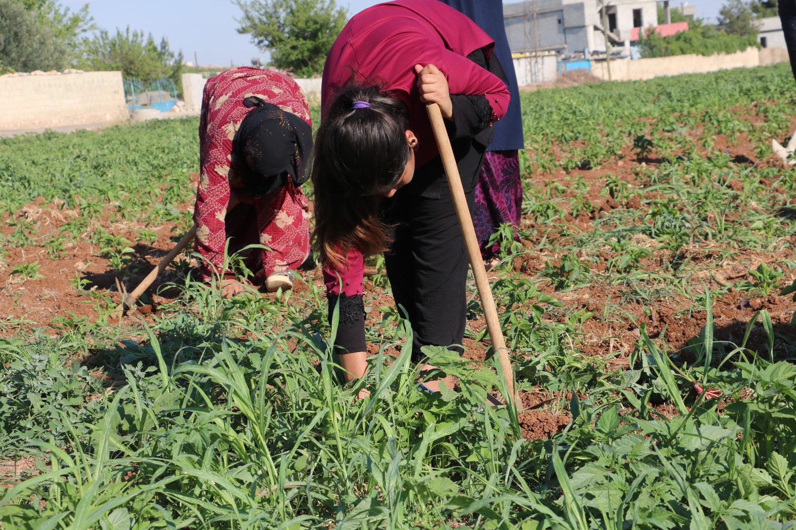İşçilerle birlikte çalışan tarladaki ürünlerin sahibi Yasemin Ekmen, “Tarlamda kendi ekimimi yapıyorum. İsot ekmişiz, diğer sebzeleri ekmişiz. Çalışanlarımla birlikte ben de çalışıyorum. Burada kadınlar evde boş oturacağına onlara iş imkanı sağlıyorum. Onlarla birlikte çalışıyorum. Aile ekonomilerine katkıda bulunuyorum. Birbirimize destek oluyoruz. Tabiki çok zor şartlarda çalışıyoruz. Güneşin en az 40 derece. Çok zor yönleri var ama çok güzel yönleri de var. Koronadan uzaktayız. Burada herhangi bir vakaya da rastlamadık. Biberlerimizi ektik, şu anda onların çapasını yapıyoruz. Zararlı bitkileri temizliyoruz” ifadelerini kullandı.