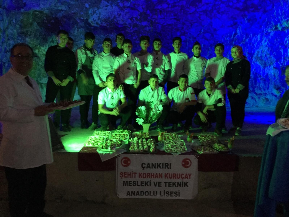 Şehit Korhan Kuruçay Mesleki ve Teknik Anadolu Lisesi öğrencileri tarafından yiyecek içecek hizmetleri alanı öğrencileri açık büfe dersinin 5 bin yıllık olan Tuz Mağarası’nda işlediler. Tuz Mağarası’nda işlenen ders kapsamında öğrenciler hünerlerini sergileyerek çeşitli yiyecek ve içecekler ürettiler. Üretilen yiyecekler katılımcılara ikram edildi.