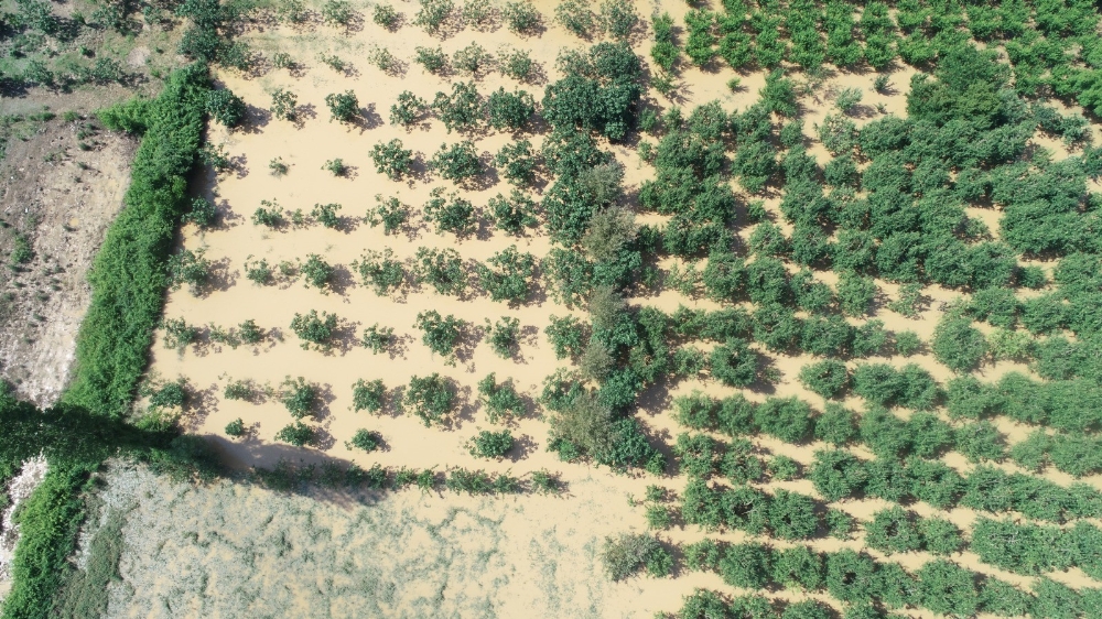 Dudaklı Köyü’nün tarım arazileri selden en çok etkilenen alanlar oldu. Şeftali, armut, ayva ve elma bahçelerini sel suları bastı. Her türlü sebzenin yetiştiği verimli tarım alanlarındaki afet görüntüleri ise havadan görüntülendi.