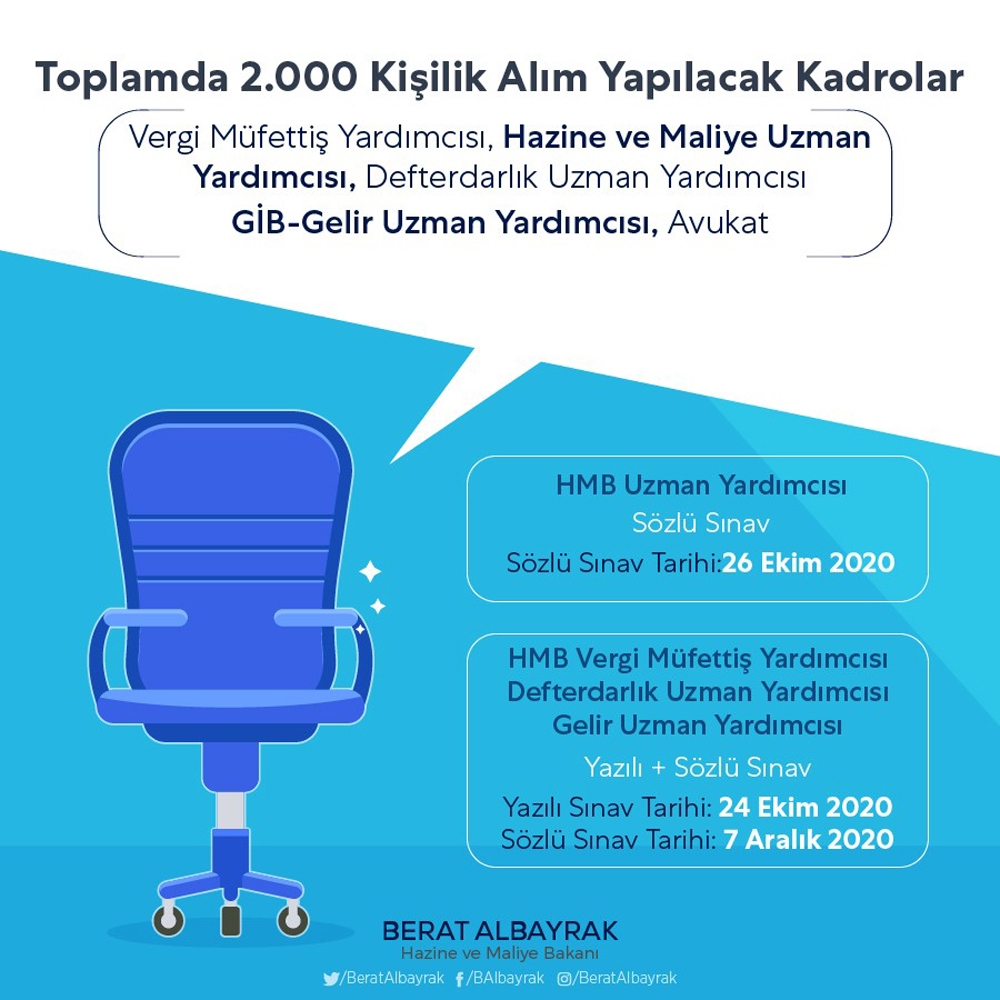Albayrak açıklamada, "Ekonomimiz için verdiğimiz mücadeleye katılmak isteyen arkadaşlarımıza yeni kadrolar açıyoruz. Böylece Hazine ve Maliye, Defterdarlık, Gelir Uzman Yardımcılıkları ile Vergi Müfettiş Yardımcılığı ve Avukat kadrolarını içine alan 2 bin kadronun müjdesini veriyoruz" ifadelerini kullandı. Personel alımında detayların yer aldığı paylaşıma göre, sözlü ve yazılı sınav yöntemleri kullanılacak. Hazine ve Maliye Uzman Yardımcılığı için 26 Ekim 2020 tarihinde sözlü sınav yapılacak. Defterdarlık ve Gelir Uzman Yardımcılıkları ile Vergi Müfettiş Yardımcısı, yazılı ve sözlü sınav yöntemi ile doldurulacak olup yazılı sınav 24 Ekim, sözlü sınav 7 Aralık tarihlerinde gerçekleştirilecek.