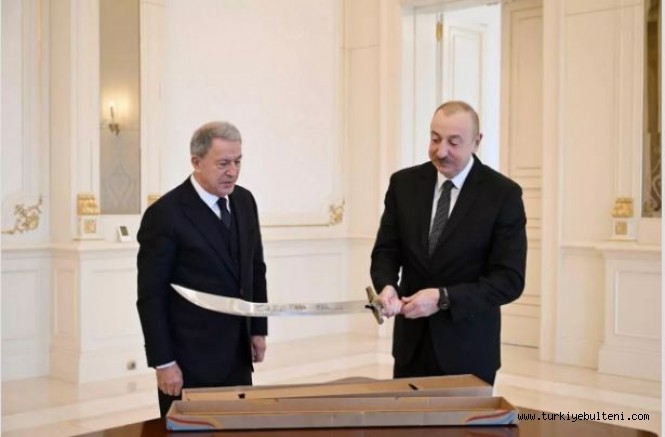 Görüşmede ayrıca Hulusi Akar, Azerbaycan Cumhurbaşkanı Aliyev’e hatıra hediyesi olarak "Kılıç" takdim etti.