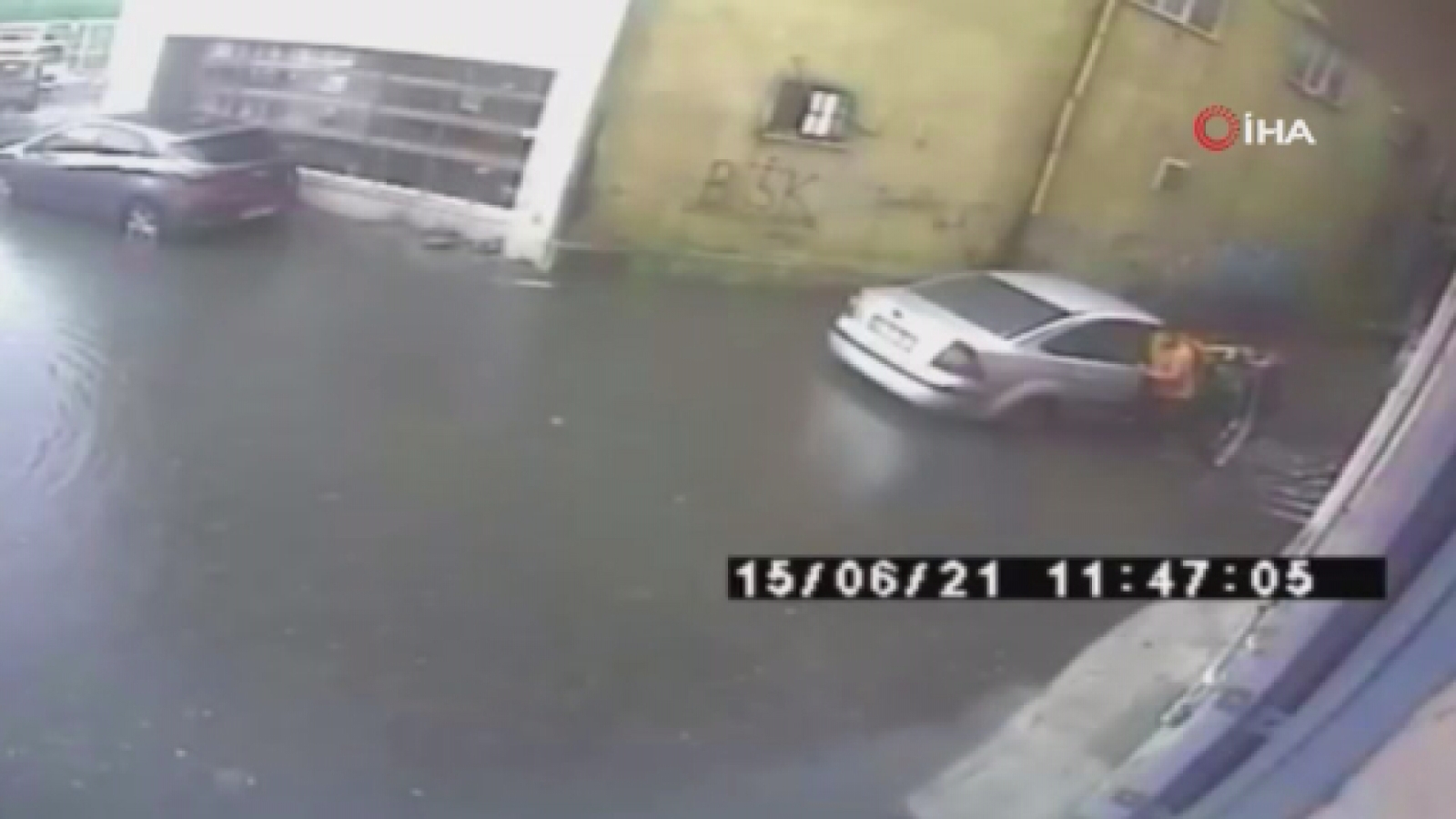 Otomobilin suya girdiği ve daha sonra vatandaşlar tarafından çıkarılması ise bir iş yerinin güvenlik kamerasına yansıdı.