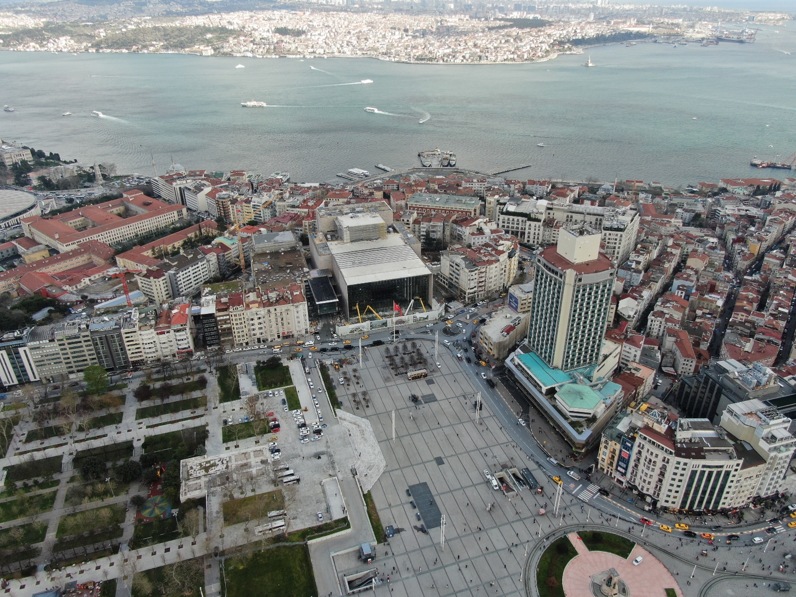 İstanbul’un simgelerinden olan Taksim’deki Atatürk Kültür Merkezi (AKM) inşaatında çalışmalar korona virüs tedbirlerine uyularak tüm hızıyla sürüyor. Taksim’deki Atatürk Kültür Merkezi’nin (AKM) kaba inşaatının yüzde 90’ı tamamlandı. İnşaatında her geçen gün sona doğru yaklaşılan AKM’nin havadan çekilen görüntülerinde dış cephenin neredeyse tamamlandığı ve son haline yaklaştığı görülüyor. İşçiler AKM’nin son halindeki cam cephelerine yerleştirilen parçaları montajını yapıyor. Yıkılan AKM’nin mimarı olan Hayati Tabanlıoğlu’nun oğlu mimar Murat Tabanlıoğlu imzasını taşıyan yeni Atatürk Kültür Merkezi’ndeki işçilerin hummalı çalışması pandemi sürecinde kurallara uyularak devam ediyor. 5 bloktan oluşacak AKM binasında 2 bin 500 kişilik bir opera salonu, 800 kişilik tiyatro salonu, bin kişilik konferans salonu, 285 kişilik sinema salonu, 250 kişilik oda tiyatrosu, bir sergi salonu, bir kütüphane, 885 araçlık otopark yer alacak. Binanın dış cephesi büyük bir ekrana dönüştürülecek şekilde inşa ediliyor. Böylece Taksim Meydanı’ndaki vatandaşlar binanın dışına yansıtılan tiyatro, bale, opera gibi etkinliklerin temsillerini izleyebilecekler.