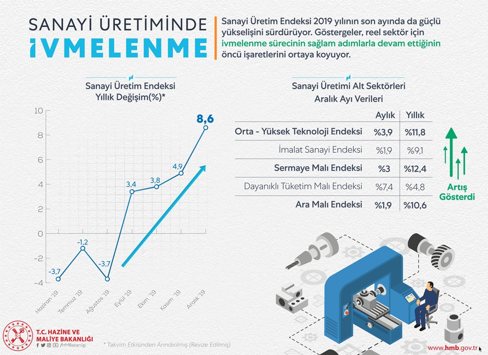 Hazine ve Maliye Bakanı Berat Albayrak, Twitter hesabından Sanayi Üretim Endeksi verilerini değerlendirdi. Albayrak, Sanayi Üretim Endeksi’nin 2019 yılının son ayında da güçlü bir yükseliş gösterdiğini belirtti. Göstergeler reel sektör için ivmelenme sürecinin sağlam adımlarla devam ettiğinin işaretlerini ortaya koyarken, Bakan Albayrak’ın verdiği bilgilere göre sanayi üretimi alt sektörleri Aralık ayı verilerine göre Orta-Yüksek Teknoloji Endeksi aylık yüzde 3,9 oranında artış gösterirken, yıllık olarak yüzde 11,8 artış gösterdi. İmalat Sanayi Endeksi aylık yüzde 1,9 artış gösterirken, yıllık 9,1 olarak arttı. Sermaye Mali Endeksi’nin aylık büyüme oranı yüzde 3 olurken, yıllık yüzde 12,4 oldu. Dayanıklı Tüketim Malı Endeksi aylık yüzde 7,4 artış gösterirken, yıllık 4,8 artış gösterdi. Ara Malı Endeksi aylık yüzde 1,9 oranında artış sağlarken, yıllık 10,6 oranında artış gösterdi.