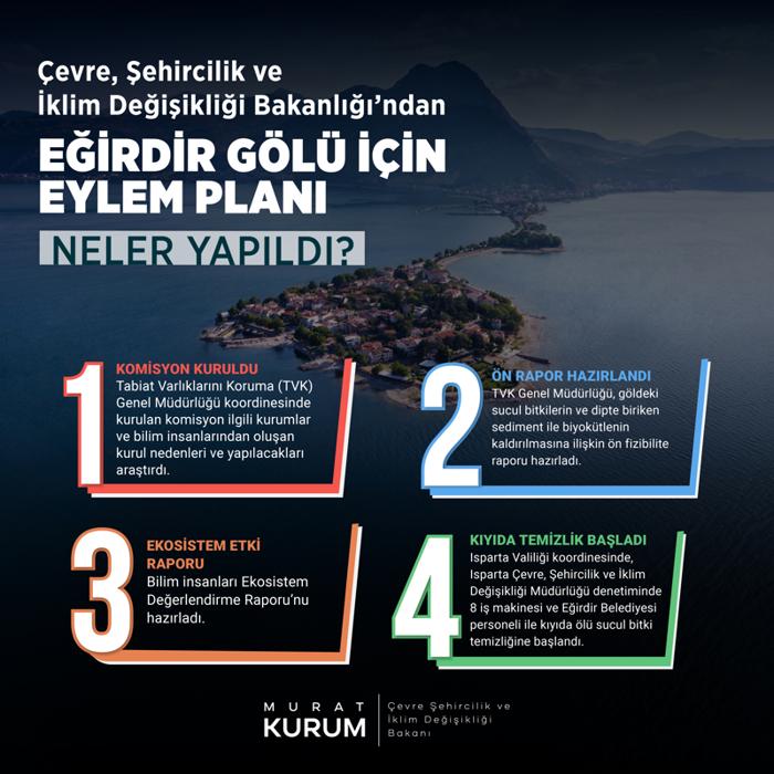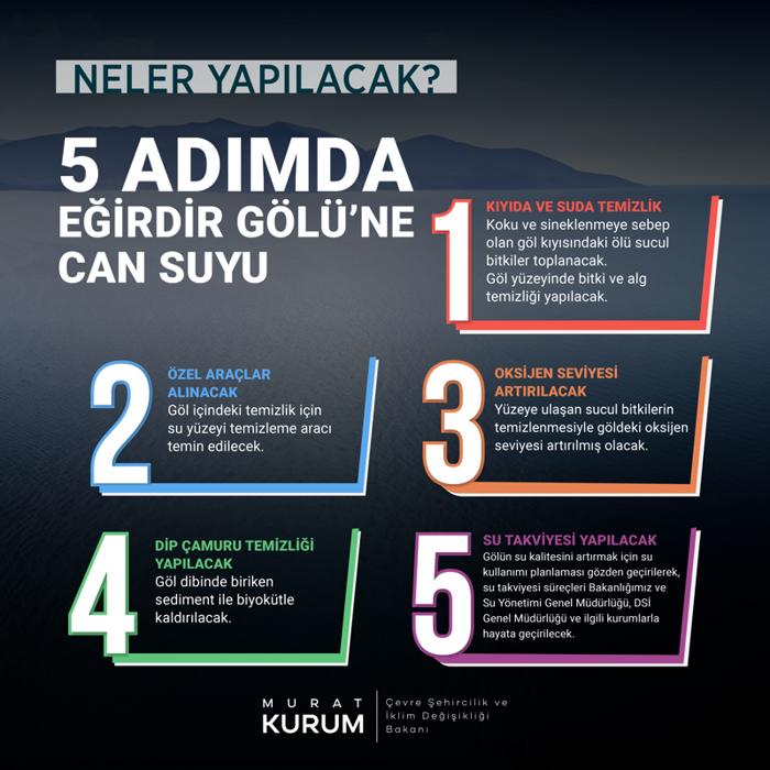 Sosyal medya hesabından göl için ilk aşamada hayata geçirilen 9 maddelik eylem planını açıklayan Bakan Murat Kurum, "Eşsiz güzellikteki Eğirdir Gölümüze can suyu verecek eylem planımız hazır. Başta dip çamuru temizliği ve su takviyesi olmak üzere gerekli tüm adımları atacağız" ifadelerini kullandı.