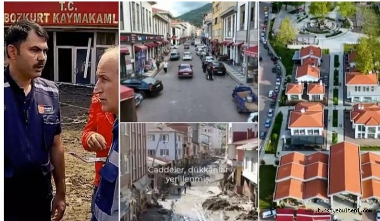 En ağır yıkımın yaşandığı Kastamonu'nun Bozkurt ilçesinin yeniden inşa edilmiş halini gösteren bir video paylaşan Bakan Kurum, "Büyük bir felaketti. Bütün ilçe tahrip olmuştu. O gün Bozkurtlu hemşerilerimize bir söz vermiştik. 'Sizi yalnız bırakmayacağız, bize güvenin' demiştik. Sözümüzü tuttuk. Bozkurt'u 1 yılda ayağa kaldırdık. Evleri, dükkanları, caddeleri yeniden inşa ettik. Allah milletimize bu felaketleri bir daha yaşatmasın" ifadelerini kullandı.