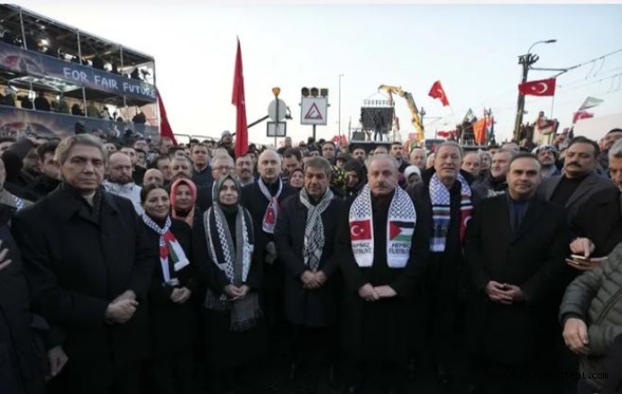 TÜGVA öncülüğünde Milli İrade Paltformu tarafından STK'ların katılımıyla yeni yılın ilk gününde Galata Köprüsü'nde Gazze için düzenlenen tarihi mitinge Bakanlar ve AK Partili isimler de katıldı.