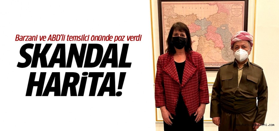 Barzani, ABD'li Nadine Maenza ile Türk topraklarının bölünmüş olarak gösterildiği "Asyadaki Türkiye'nin yeni bir haritası" başlıklı haritanın önünde poz verdi.