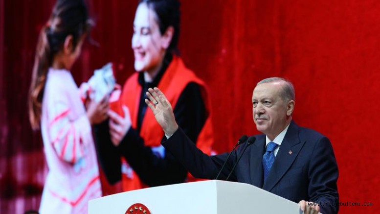 Erdoğan, Kahramanmaraş depremlerinin yaralarının sarılmaya devam ettiğini ve 200 bin konutun anahtarlarının vatandaşlara teslim edildiğini, toplamda 450 bin konut yapacaklarını söyledi. 6 Şubat depremlerinde yaşananları hatırlatarak, bazı kesimlerin istismar girişimlerine tepki gösterdi ve Kızılay'ın deprem bölgesinde önemli çalışmalar yürüttüğünü vurguladı.