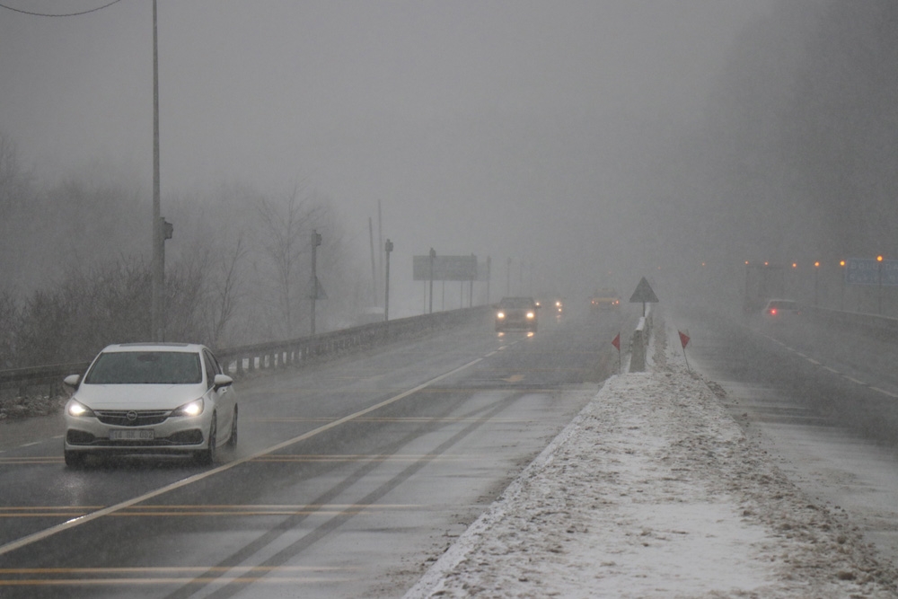 Kar yağışıyla birlikte etkili olan sis nedeniyle görüş mesafesi yer yer 20 metreye kadar düşüyor.