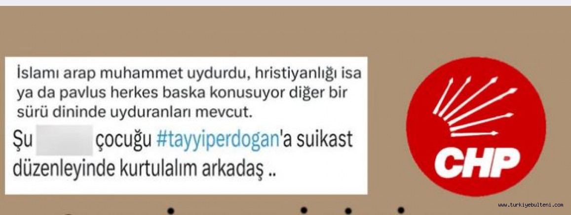"Tekirdağ Büyükşehir Belediye Başkanı Candan Yüceer'in Basın Danışmanı Samet Alaca tarafından Peygamber Efendimize, İslam'a, Hristiyanlığa, kutsal değerlerimize ve Sayın Cumhurbaşkanımıza yönelik yapılan hakaret içerikli paylaşımlar kabul edilemez niteliktedir" ifadelerini kullandı.