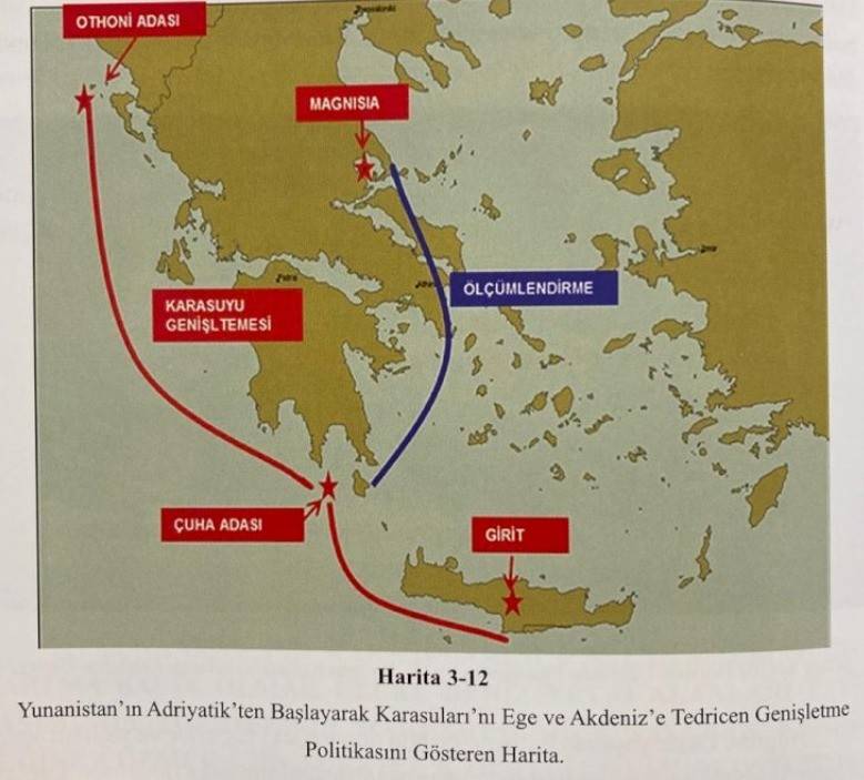 Türk Denizcilik ve Global Stratejiler Merkezi / Mavi Vatan DEGS Başkanı Emekli Tümamiral Cihat Yaycı, Türkiye ile Ege’de sürekli gerginliği tırmandıran Yunanistan’ın nihai amacının karasularını 12 mile çıkarmak olduğunu sosyal medya hesabından yayınladığı harita üzerinden ortaya koydu.
