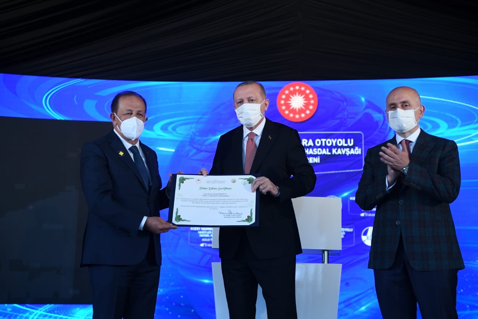 Kuzey Marmara Otoyolu Yönetim Kurulu Başkanı Cemal Kalyoncu, 50 bin fidanlık bağış sertifikasını Cumhurbaşkanı Erdoğan’a takdim etti.