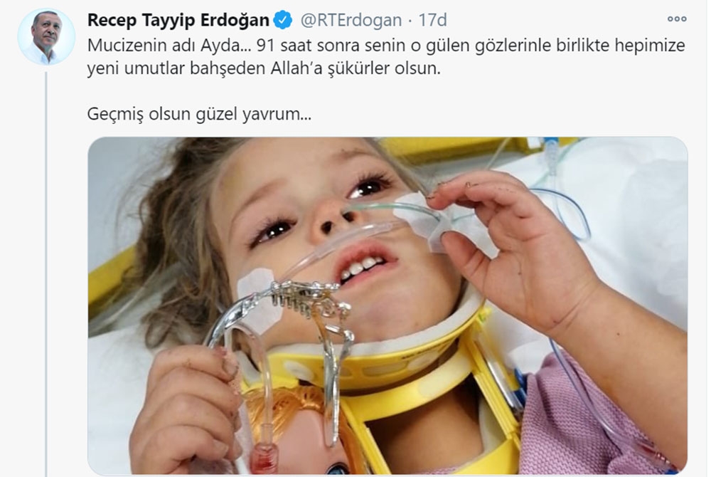 Cumhurbaşkanı Erdoğan, "Mucizenin adı Ayda... 91 saat sonra senin o gülen gözlerinle birlikte hepimize yeni umutlar bahşeden Allah’a şükürler olsun. Geçmiş olsun güzel yavrum." notuyla Ayda’nın fotoğrafını sosyal medya hesabından paylaştı.