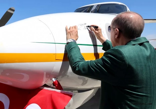 Burada altı adet hava aracını inceleyen Erdoğan, yangın söndürme uçağını imzaladı ve üzerine 'NEFES' ismini yazdı.