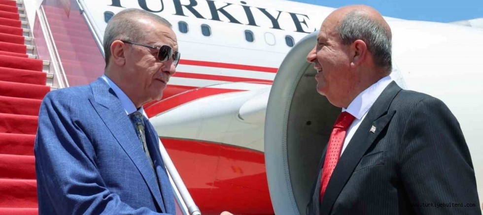 ülkeleri turunun son durağı Birleşik Arap Emirlikleri’nin ardından Kuzey Kıbrıs Türk Cumhuriyeti’ne (KKTC) geçti. Cumhurbaşkanı Erdoğan, Barış ve Özgürlük Bayramı ve Yeni Ercan Havalimanı’nın açılışı kapsamında bugün açılışını yapacağı Yeni Ercan Havalimanı’na ulaştı. Cumhurbaşkanlığı’na ait özel uçak “TC-TRK” ile TSİ 13.20 sıralarında havalimanına inen Cumhurbaşkanı Erdoğan’ı, KKTC Cumhurbaşkanı Ersin Tatar resmi törenle karşıladı. İstiklal Marşı’nın okunduğu törende Erdoğan, karşılama kıtasını selamladı. Cumhurbaşkanı Erdoğan’a daha sonra KKTC heyeti tanıtıldı.