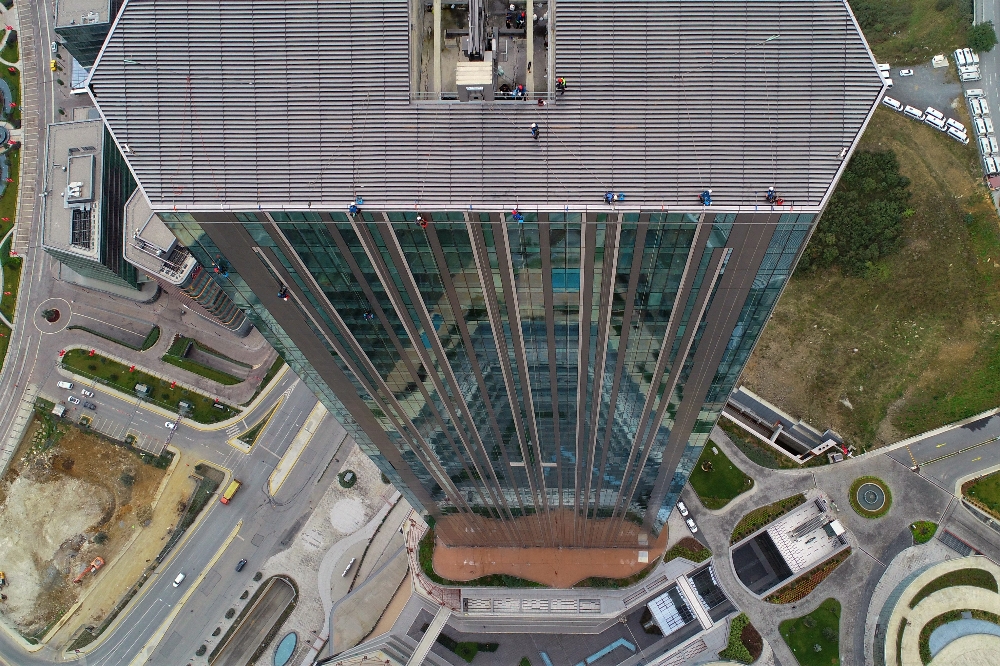 Gökdelenlerin dış cephe temizliklerinde çalışırken görmeye alışık olduğumuz endüstriyel dağcılar, yüzlerce metre yükseklikte komanda gibi çalışıyorlar. 284 metre yükseklikte iple sarkarak çalışan dağcıların zorlu mesaisi havadan görüntülendi. Çekilen görüntülerde kendilerini gökdelenin dış cephesinden sarkıtan işçiler nefes kesti. Kendilerini iple erişim teknisyeni olarak tanımlayan işçilerden bu işi hobi olarak yapan da var, hayata tutunmak için yapan da var. En ufak hataya yer olmadan dikkatli şekilde çalışan işçilerin en büyük zorluğu ise rüzgar oluyor. İşçiler çalışmaya başlamadan önce her gün rüzgar hızını kontrol ediyor, ancak bazen ani rüzgarlarla karşılaşabiliyorlar. Sepetle temizlenmeyen yerleri temizleyebilen ve sepete göre daha güvenli olan iple sarkan işçiler gerekli güvenlik önlemlerini defalarca kontrol ettikten sonra yavaşça aşağı iniyorlar. Yanlarında camları silmek için su dolu kovaları ve cama tutunmaları için aparatları bulunuyor. Böylece bir elleriyle sabit bir şekilde cama tutunabilirken diğer elleriyle temizlik yapabiliyorlar.