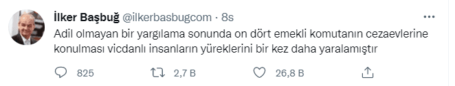 Mahkeme kararı ile 28 Şubat darbesinde rolü olan on dört emekli komutanın tutuklanmasına Eski Genelkurmay Başkanı İlker Başbuğ, sosyal medyadan attığı tweetle tepki gösterdi. Başbuğ, "Adil olmayan bir yargılama sonunda on dört emekli komutanın cezaevlerine konulması vicdanlı insanların yüreklerini bir kez daha yaralamıştır." mesajını paylaşarak darbecilerin avukatlığına soyundu.
