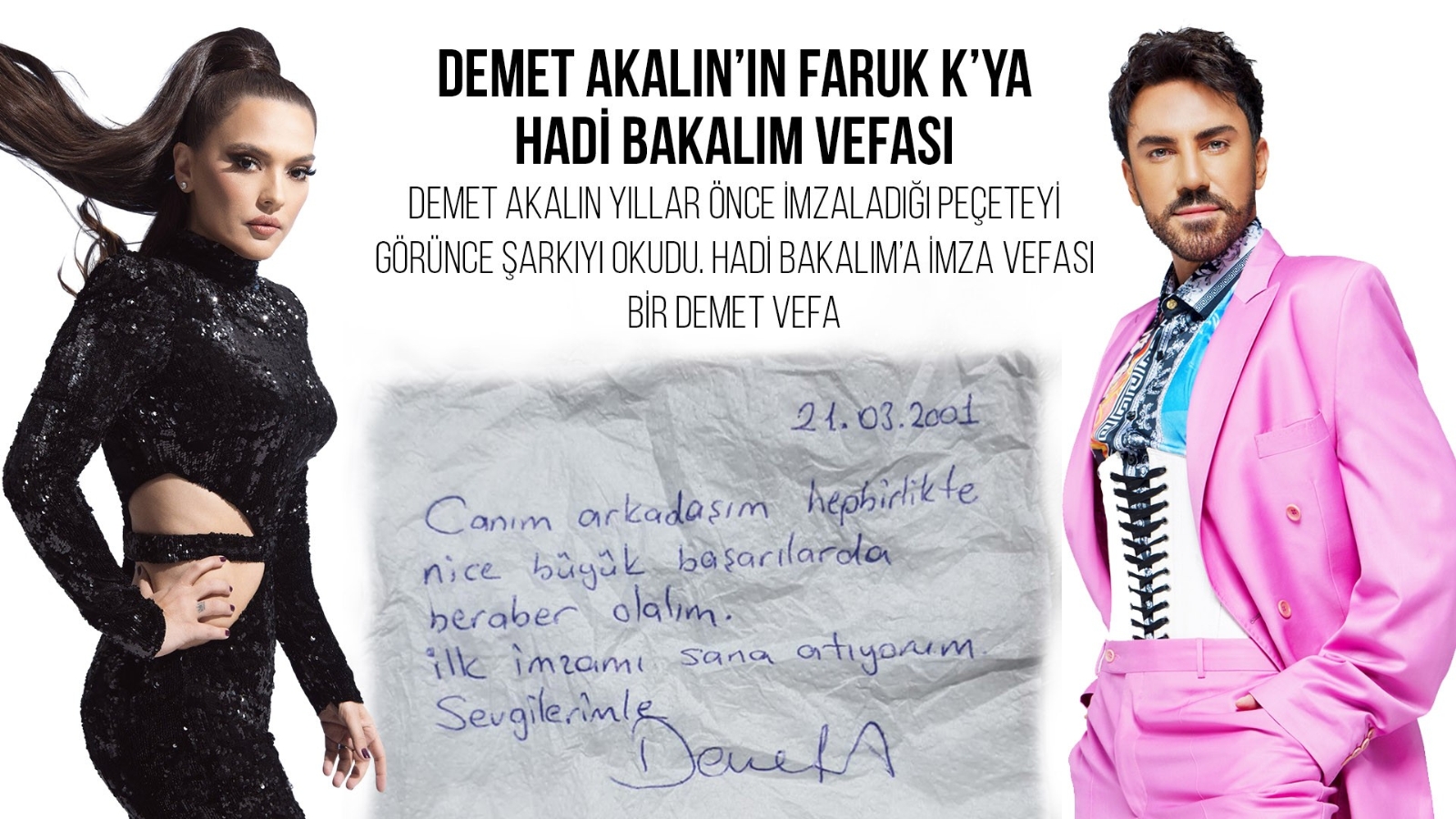 Ünlü şarkıcı Demet Akalın’ın, Faruk K.’ya yeniden yorumladığı "Hadi Bakalım" şarkısında eşlik etti. Demet Akalın’a jesti için teşekkür eden Faruk K., yıllar önce aralarında geçen o konuşmayı ve imzayı anlattı.