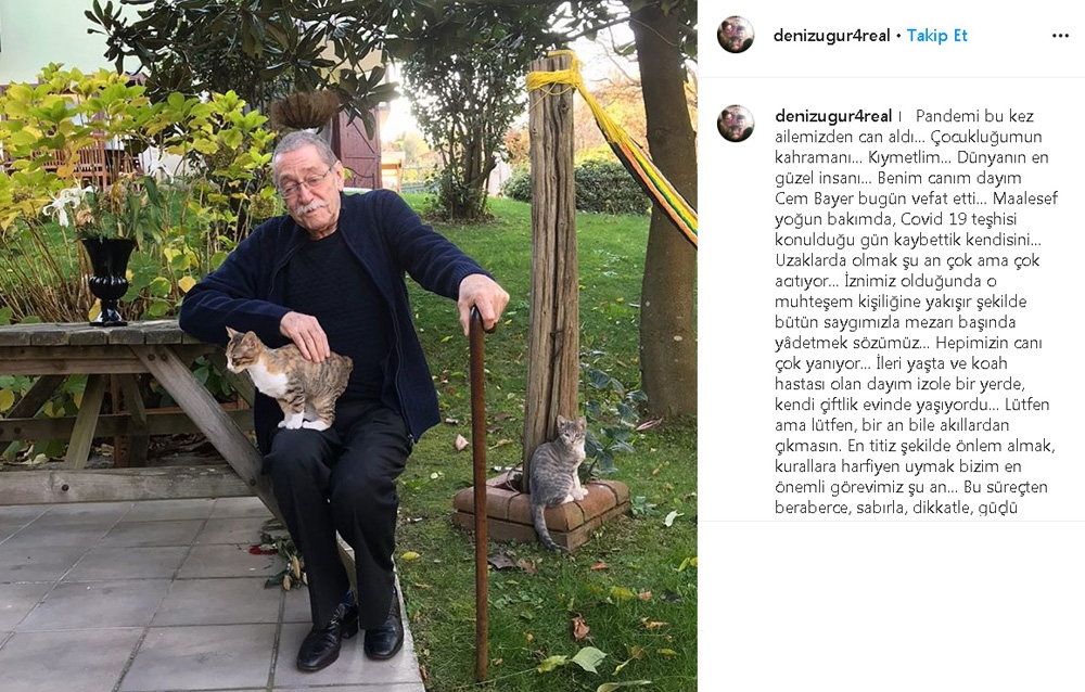 Vefat eden dayısı Cem Bayer’in fotoğrafını sosyal medyadan paylaşan Deniz Uğur, "Pandemi bu kez ailemizden can aldı, çocukluğumun kahramanı, kıymetlim. Dünyanın en güzel insanı, benim canım dayım Cem Bayer bugün vefat etti. Maalesef yoğun bakımda, Covid-19 teşhisi konulduğu gün kaybettik kendisini. Uzaklarda olmak şu an çok ama çok acıtıyor. İznimiz olduğunda o muhteşem kişiliğine yakışır şekilde bütün saygımızla mezarı başında yad etmek sözümüz. Hepimizin canı çok yanıyor. İleri yaşta ve koah hastası olan dayım izole bir yerde, kendi çiftlik evinde yaşıyordu. Lütfen ama lütfen, bir an bile akıllardan çıkmasın. En titiz şekilde önlem almak, kurallara harfiyen uymak bizim en önemli görevimiz şu an. Bu süreçten beraberce, sabırla, dikkatle, güçlü çıkmamızı Allah’tan diliyorum” diye yazdı.