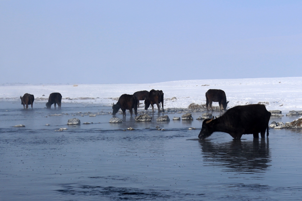 Çaldıran-Doğubayazıt yolu üzerinde bulunan Kaz Gölü’nün sularında otlanan mandalar, sabah sahipleri tarafından bölgeye getiriliyor. Kış mevsiminin en çetin geçtiği yerleşim yerlerinin başında gelen ve kış mevsimi süresince hava sıcaklığının bazen sıfırın altında 35-40 dereceye kadar düştüğü ilçede, besiciler ilginç yöntemlerle hayvanlarını besliyor.