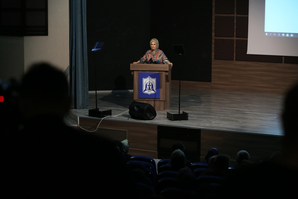 Bilim, teknoloji ve sanat gibi alanların, mutlaka insanlığa fayda sağlamayı amaçlayan bir odak noktasına sahip olması gerektiğini söyleyen Emine Erdoğan, "Nobel Ödüllü bilim insanımız Aziz Sancar’ın ifadesiyle ’başarılı olmak, Nobel almak değildir. Başarılı olmak ailenize, memleketinize, vatanınıza, insanlığa hizmet etmek demektir.’ Dünyada yaşanan kaos, bazen bilim ve teknolojinin hiç de iyi niyetli olmayan amaçlarla kullanılabildiğini gösteriyor. Birileri bir yandan çaresiz hastalıklara şifa olsun diye laboratuvarlarda sabahlarken, birileri aynı vakti, biyolojik silah geliştirmek için de kullanabiliyor. İşte yol ayrımı buradadır. Ben bu güzide kurumumuzun, evlatlarımızı en güncel bilgilerle donattıklarını biliyorum. Bunun da ötesinde, bilgiye fazilet katarak, insanlığın ihtiyaç duyduğu ahlaki yükselişe de katkı sunduklarına yürekten inanıyorum. Bu vesile ile imam hatip liselerinin kurucusu Celaleddin Ökten hocamızı da buradan rahmetle anmak isterim. Onun vizyonu ’Asrın ihtiyaçlarına müdrik, şarkı ve garbı iyi bilen bir nesil’ yetiştirmekti. Yalnızca doğuyu ya da yalnızca batıyı değil, iki dünyayı da anlayan, ilme bir bütün olarak bakan öğrenciler yetiştirmek istemişti. Kur’an’ın mesajını tam olarak idrak edebilmek ve doğru anlatabilmek için tüm ilimlere yönelmenin gerekli olduğunu anlatmıştı Allah ondan razı olsun. Ona olan borcumuzu ödemenin tek yolu, hayalini kurduğu nesiller olabilmektir. O nedenle, sizlere büyük iş düşüyor kıymetli gençler. Aklınızı bilimle, ilimle yoğurup, edindiğiniz bilgiyi dünyanın sorunlarına çözüm olacak şekilde insani faziletlerle işlemelisiniz. Çünkü imam hatipli olmak bunu gerektirir. Vicdan sahibi insanlar olmak, kendinden başkasını düşünebilmeyi, elindeki tüm imkanları insanlığa hizmetkar kılmayı gerektirir" ifadelerini kullandı.