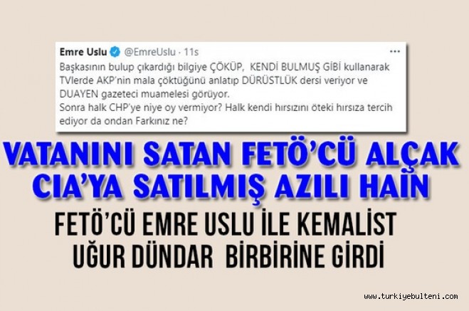 FETÖ'cü Emre Uslu, Uğur Dündar'ın mesajına şöyle cevap verdi: "Başkasının bulup çıkardığı bilgiye çöküp, kendi bulmuş gibi kullanarak TV'lerde AKP’nin mala çöktüğünü anlatıp dürüstlük dersi veriyor ve duayen gazeteci muamelesi görüyor. Sonra halk CHP’ye niye oy vermiyor? Halk kendi hırsızını öteki hırsıza tercih ediyor da ondan. Farkınız ne?"
