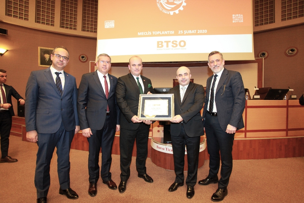 Toplantının ardından BTSO Yönetim Kurulu Başkanı İbrahim Burkay ve Meclis Başkan Yardımcısı Murat Bayizit, Merkez Bankası Başkanı Murat Uysal’a fidan sertifikası ve Bursa’yı simgeleyen hediye takdim etti.
