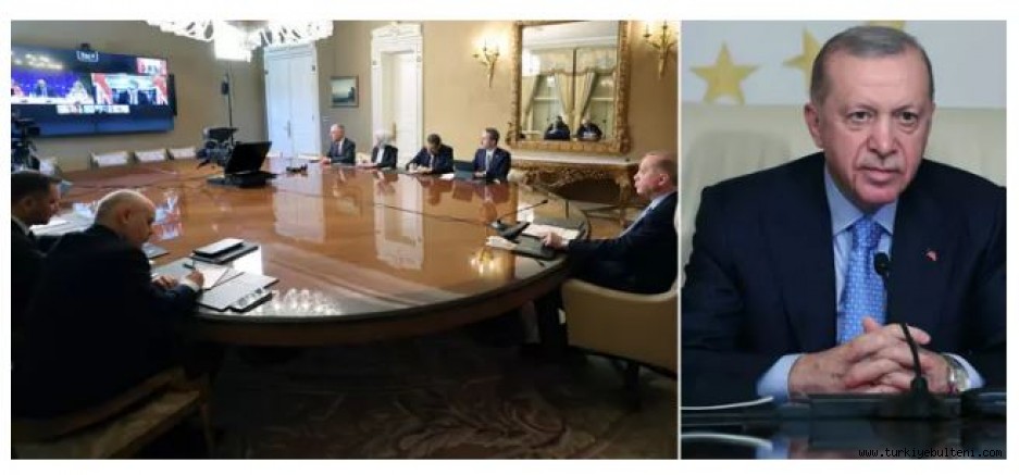 Avrupa Birliği'nin (AB) düzenlediği Fikirdaş Ülke Liderleri Çevrimiçi Toplantısı'na Vahdettin Köşkü'nden katılan Cumhurbaşkanı Recep Tayyip Erdoğan, burada yaptığı konuşmada, Türkiye olarak ilk günden itibaren savaşın diyalog yoluyla sonlandırılması için çok yoğun ve samimi çaba harcadıklarını belirtti.