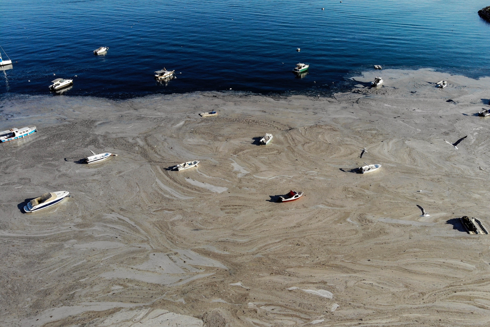 Kadıköy Fenerbahçe Sahili’nde denizin dibini ve yüzeyini kaplayan deniz salyası, yoğunlaşmaya devam ediyor. Son aylarda Marmara Denizi ve çevresinde oluşan denizin dibini ve yüzeyini kaplayan deniz salyası havadan görüntülendi. İstanbul sahillerinde yoğunluğunu artıran deniz salyası, özellikle sabah saatlerinde yoğun bir kokuyu da beraberinde getiriyor. Marmara Denizi’nde sıklıkla görülen ve deniz salyası olarak bilinen müsilaj, sahil şeridinde oluşturduğu tabaka ile korkutucu görüntülere neden oldu.