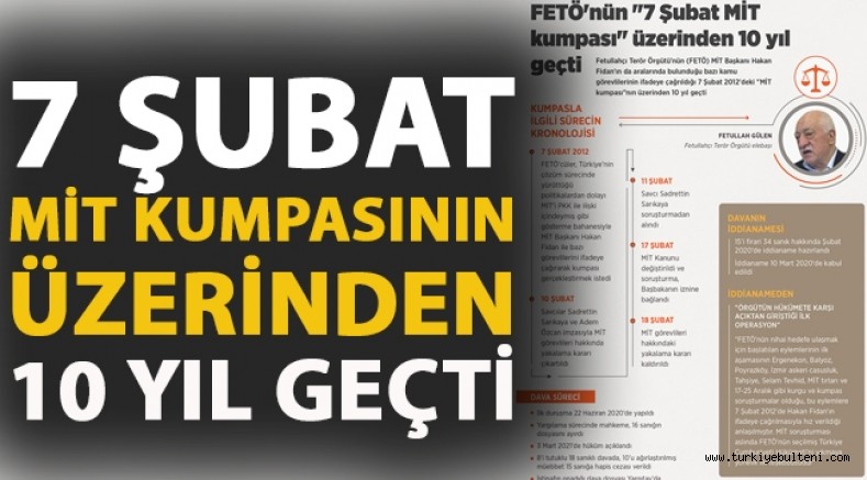 Fetullahçı Terör Örgütü'nün (FETÖ) Türkiye Cumhuriyeti hükümetine karşı açıktan giriştiği ilk operasyon olarak tanımlanan ve MİT Başkanı Hakan Fidan'ın da aralarında bulunduğu bazı kamu görevlilerinin ifadeye çağrıldığı 7 Şubat 2012'deki "MİT kumpası"nın üzerinden 10 yıl geçti.
