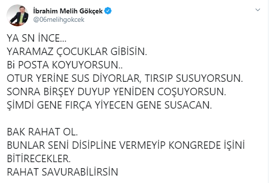 ‘Ya Sayın İnce... Yaramaz çocuklar gibisin. Bi posta koyuyorsun… Otur yerine sus diyorlar, tırsıp susuyorsun. Sonra bir şey duyup yeniden coşuyorsun. Şimdi gene fırça yiyecen gene susacan. Bak rahat ol. Bunlar seni disipline vermeyip kongrede işini bitirecekler. Rahat savurabilirsin.’
