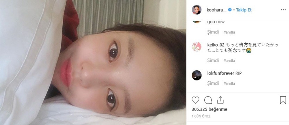 Goo Hara, dün gece 1.5 milyon takipçisinin bulunduğu sosyal medya hesabından yatakta çektiği bir fotoğrafını "İyi geceler" notuyla paylaşmıştı.