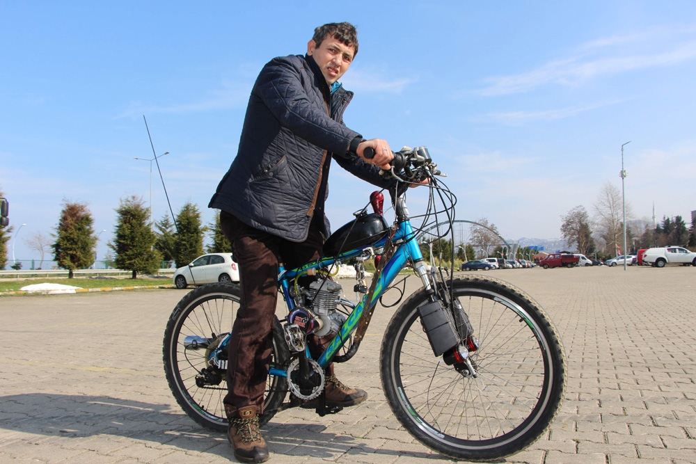43 yaşındaki Erol Bahadır, küçük yaştan beri meraklı olduğu otomobili ekonomik durumu iyi olmadığı için alamayınca bu merakını bisiklete motor takarak giderdi. Yaklaşık 20 kilometre uzaklıktaki evine gitmek için taksi parası yetiştiremeyince böyle bir yönteme başvurduğunu belirten Bahadır, bu yöntemle önemli ölçüde tasarruf sağladığını söyledi. Bisiklete motor taktırarak saatte 50 kilometre hız yaptığını dile getiren Bahadır, yaklaşık 20 kilometre yol için her defasında 40-45 TL para ödediğini, uygulamaya koyduğu yöntem sayesinde bundan kurtulduğunu ifade etti. Motorlu bisikletin seri üretimini düşündüğünü kaydeden Bahadır, “Küçüklüğümden beri araba sevdam vardı. Araba alamadığım için bisiklete motor attırdım. Mahallemle işim arası yaklaşık 20 kilometre. İşe gidip gelmelerde her defasında taksiye 40-45 TL para ödüyordum. Bende bu masraftan kurtulmak için böyle bir yola başvurdum. İzmir’de bulunan arkadaşıma motor siparişi verdim. Kendisi kargoyla motoru bana gönderdi, bende bisikletime monte ettim. Bütün aksamlarını yerine yerleştirerek çalışır vaziyete getirdim. Saatte 50 kilometre hız yapıyor. Her gün mahallemden ilçe merkezine gidip geliyorum. Deposuna 35 TL’lik benzin koyuyorum. Araba alamadığım için bisiklete motor taktırarak masraftan kurtardım. Her şeyini kendim yapıyorum. Yakında bunun seri üretimini yapmayı düşünüyorum. İlkokul mezunuyum. Vakfıkebir’den Trabzonspor maçı için Akyazı’ya gidiş geliş yaklaşık 10 TL’lik benzin yaktım, taksi tutup gitseydim 190 TL verecektim. Dolmuşlara, taksiye para vermektense bisiklete motor atarak köyüme çıkıyorum. Motorumu söküp tüm detayına kadar tekrar takabiliyorum. Arıza yapsa bile kendim tamir ediyorum. Çevremden olumlu tepkiler alıyorum. Herkes bana bunu üretip satmamı istiyor. Nasıl yaptığımın formülünü vermek istemiyorum, sonra bana rakip çıkarlar. Bisiklet ve motorun maliyeti bana 3 bin TL’yi buldu. Hepsini hazır alsaydım 8-9 bin TL’yi bulurdu. Yakında güneş enerjisiyle çalışacak bisiklet yapmayı planlıyorum. Bu konuda hazırlığım var” diye konuştu.