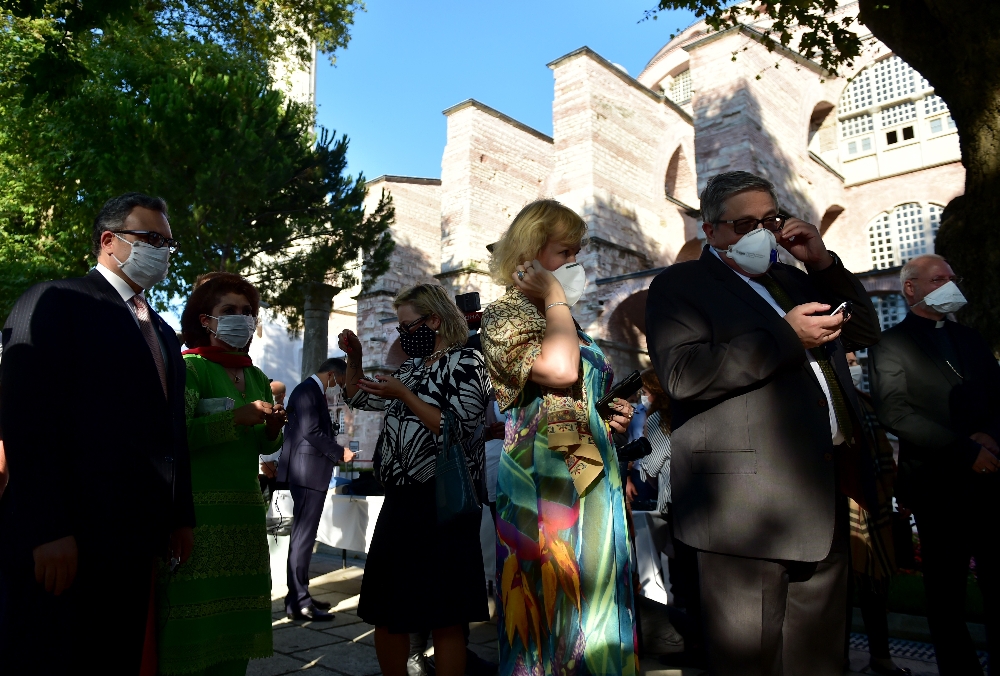 Cumhurbaşkanlığı Sözcüsü İbrahim Kalın, büyükelçilerle birlikte Ayasofya-i Kebir Camii Şerifi’ni ziyaret gerçekleştiriyor. Kalın, Ayasofya’nın önünde büyükelçilere cami hakkında bilgi verdi ardından da camiyi gezdirdi.