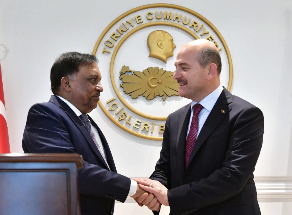 Bangladeşli mevkidaşı Han ile görüşen İçişleri Bakanı Soylu, iki ülke arasında göç, güvenlik ve ikili ilişkilere dair başlıkları ele aldı. Bakan Soylu mevkidaşını önce Bakanlık girişinde resmi törenle karşıladı. Her iki bakan şeref defterinin imzalanmasına geçti. Bangladeş heyeti Soylu’nun makam odasına geçerek iki ülke arasındaki konuları konuştu. Makam odasından görüntü alınmasının ardından toplantı basına kapalı devam etti.