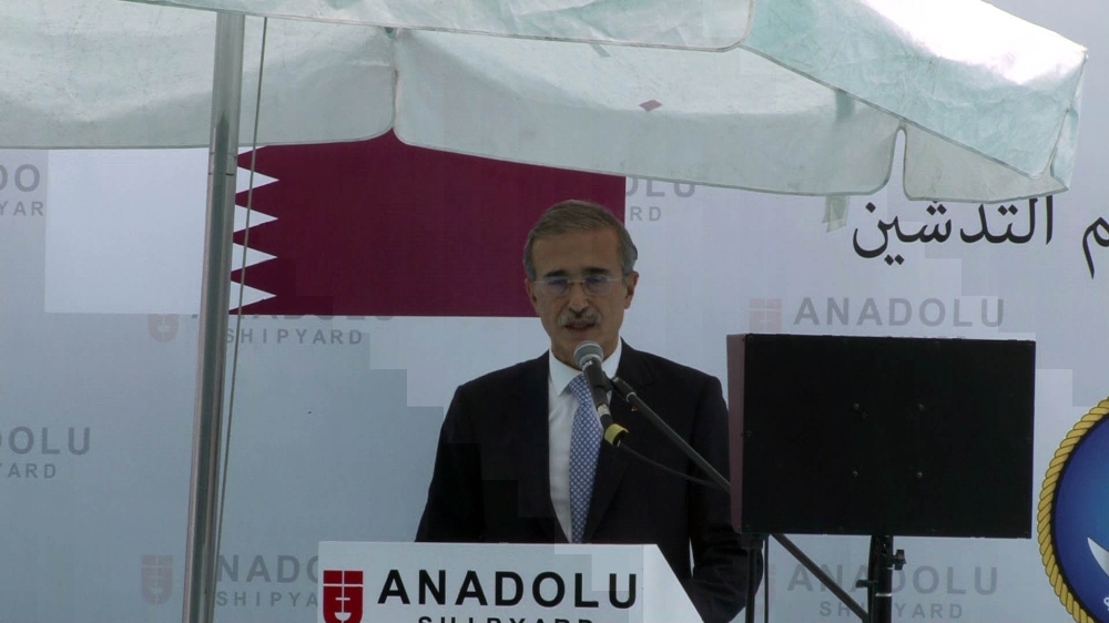 Askeri gemi inşaat sektöründe mevcutta devam eden projeler ile orta ve uzun vadeli gerçekleştirmeyi planladığımız projelerin bütçesi 12 milyar dolara ulaşacak. Artık dost ve kardeş ülkelere de bu kabiliyetleri sunmak ve onların gücüne güç katacak platformları kara deniz ve havada onların hizmetine sunmak bizim için büyük bir şeref ve mutluluk olacaktır. Bugün dost ve kardeş ülke Katar Deniz Kuvvetleri için inşası süren iki silahlı eğitim gemisinin ilkinin denize inişini gerçekleştiriyoruz. Tersanemiz yine Katar donanması için diğer platformların inşasına devam ediyor” dedi.