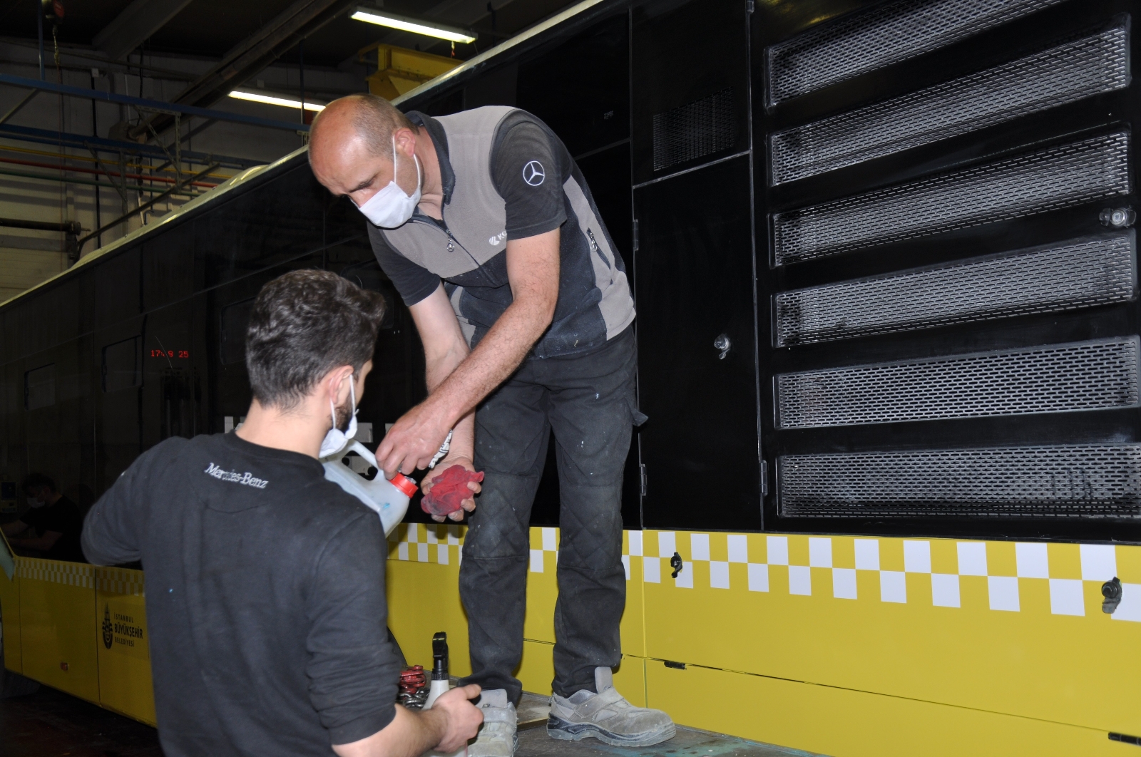 Yenilenme kapsamında oto bakım servisine getirilen İETT otobüslerinin üzerlerindeki stickerlar sökülerek yapışkan izlerden arındırılıyor. Uygun hale getirilen otobüsler daha sonra boya hazırlık fırınlarına alınarak zımpara işlemlerine tabi tutuluyor. Ardından yoklama macunları da çekilen otobüsler maskeleniyor ve boya işlemine alınıyor. Son aşama olarak da pasta cila işlemine tabi tutulan özel halk otobüsleri hizmete hazır hale getiriliyor.