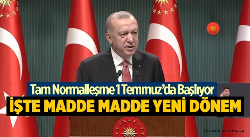 Cumhurbaşkanı Erdoğan'ın yeni normalleşme sürecine dair verdiği ilk müjde sokağa çıkma kısıtlamasının 1 Temmuz itibariyle tamamen kaldırılacağı olurken, normalleşmede madde madde aşağıda belirtilen işlemlerin uygulanmasında karar kılındı.