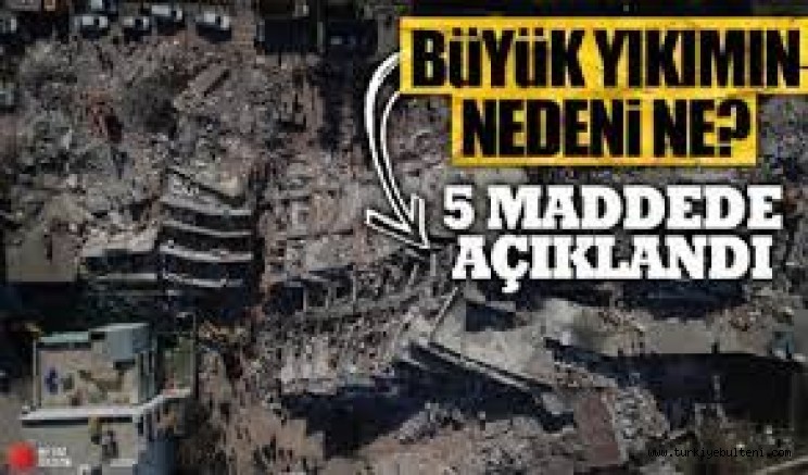 - İTÜ’nün raporunda Kahramanmaraş’ın Pazarcık ve Elbistan ilçelerinde sırasıyla 7.8 ve 7.7 büyüklüğünde oluşan şiddetli depremlerde Doğu Anadolu Fay Hattı üzerindeki 10 ilde çok sayıda betonarme binanın enkaz haline geldiği hatırlatıldı. Bu ölçekte yıkımın ana nedenleri de sıralandı. Raporda enkazın büyük olmasının arkasında birçok parametrenin etkin olduğuna dikkat çekilerek beş ana neden sıralandı:
