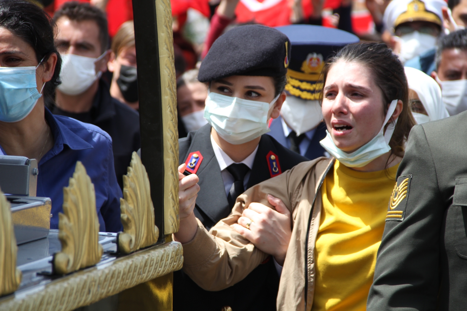 Törende şehidin annesi Ayşe Canal ve kız kardeşi Merve Kıvık’ın ayakta durmakta güçlük çektiği görüldü. Duygu dolu anların yaşandığı törende ağabeyinin tabutuna sarılan Merve Kıvık, gözyaşlarına boğuldu.