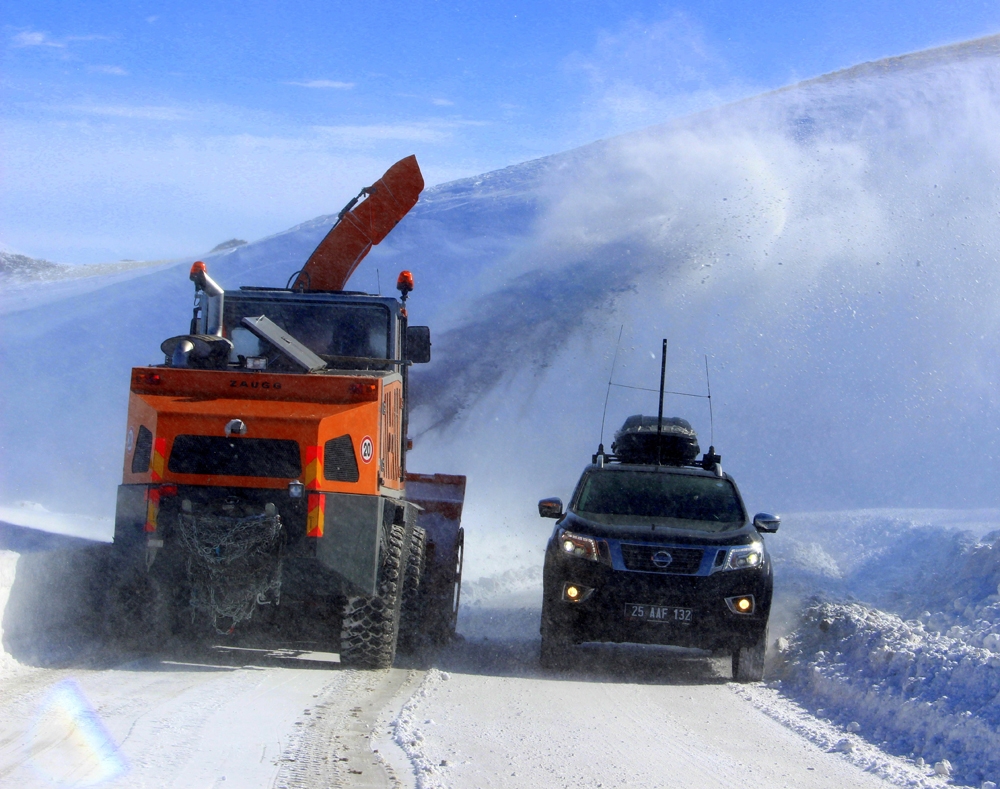 ‘Kar kaplanları’ diye anılan karla mücadele ekipleri Palandöken Dağının arka tarafında bulunan 2 bin 885 rakımlı Erzurum-Tekman karayolunda yol açma çalışmalarına koyuldu. 7/24 karla mücadele eden ekipler, yaklaşık 3,5 metreyi bulan kar yığınlarını rotatif makinesiyle savurarak yolun yeniden ulaşıma açılması için çaba sarf ediyor.