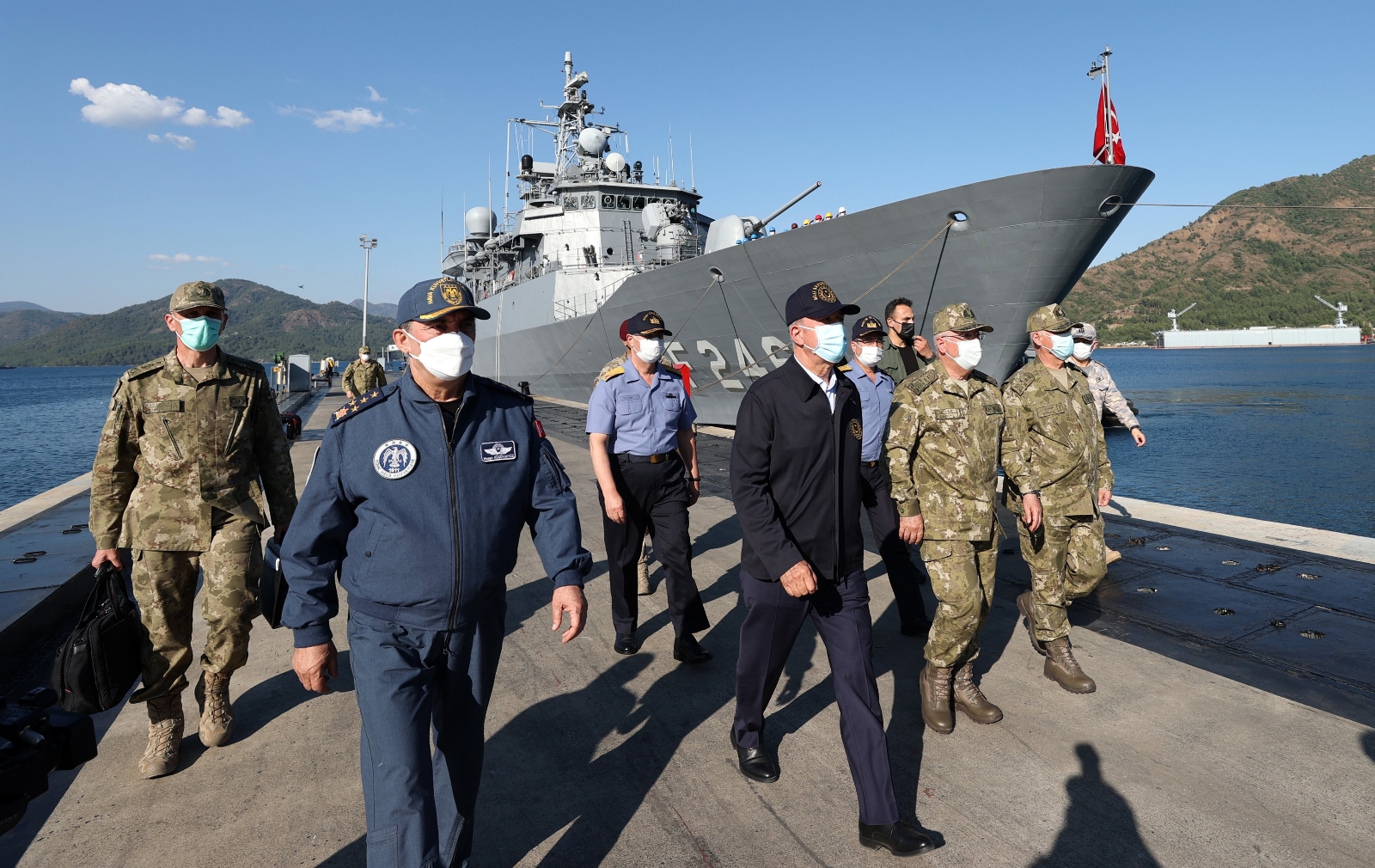 Milli Savunma Bakanı Hulusi Akar beraberinde Genelkurmay Başkanı Orgeneral Yaşar Güler, Kara Kuvvetleri Komutanı Orgeneral Ümit Dündar, Deniz Kuvvetleri Komutanı Oramiral Adnan Özbal ve Hava Kuvvetleri Komutanı Orgeneral Hasan Küçükakyüz ile dün Denizkurdu 2021 Tatbikatı’nın Doğu Akdeniz’deki “seçkin gözlemci günü” faaliyetlerini takip etti.