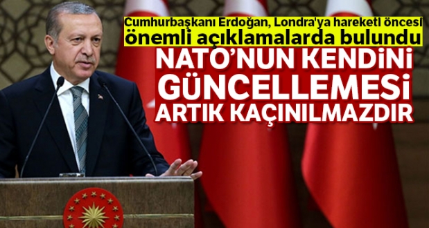 Türkiye’nin, DEAŞ ile Suriye’de göğüs göğse mücadele eden ve örgütü bozguna uğratan tek ülke olduğunu vurgulayan Cumhurbaşkanı Erdoğan, “Bu samimi çabalarımızın karşılığını biz de müttefiklerimizden bekliyoruz, terörle mücadelesinde ülkemize amasız fakatsız destek verilmesini istiyoruz. Londra toplantısı sembolik anlamanın ötesinde ittifakın 2020’li yıllara kendini uyarlamasının da ilk adımı olacaktır. Bazı çevreler art niyetli bir şekilde ülkemizin NATO’ya mensubiyetini gölgelemeye çalışsalar da bizim yerimiz ve duruşumuz bellidir. 1952’den beri yaptığımız katkılar Türkiye’nin NATO’daki vazgeçilmez konumunu gayet net gösteriyor. Ülkemizle ilgili kötü niyetli tartışmaları dikkate almadık almıyoruz. Londra’da bazı hükümet ve devlet başkanlarıyla da görüşmelerimiz olacak. Bugün, Fransa ve Almanya liderleriyle bir dörtlü zirve toplantısını da yapacağız. Bu toplantıda Suriye ve Libya başta olmak üzere bölgesel koruları ele alacağız. Toplantıda bir araya geleceğimiz liderlere Barış Pınarı Harekatında gelinen son durumu hem de Suriyeli sığınmacıların güvenli bölgeye dönüşleriyle ilgili projemizi tekrar anlatma fırsatı bulacağız. Libya’daki gelişmeler de zirve toplantısının gündeminde yer alacak. Bu ülkede bir an evvel ateşkes sağlanması için atılacak adımları konuşacağız” açıklamasını yaptı.