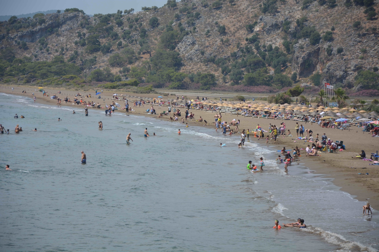 Tatilciler, İztuzu Plajı’nda denize girdi, sahilde yürüyüş yaptı.