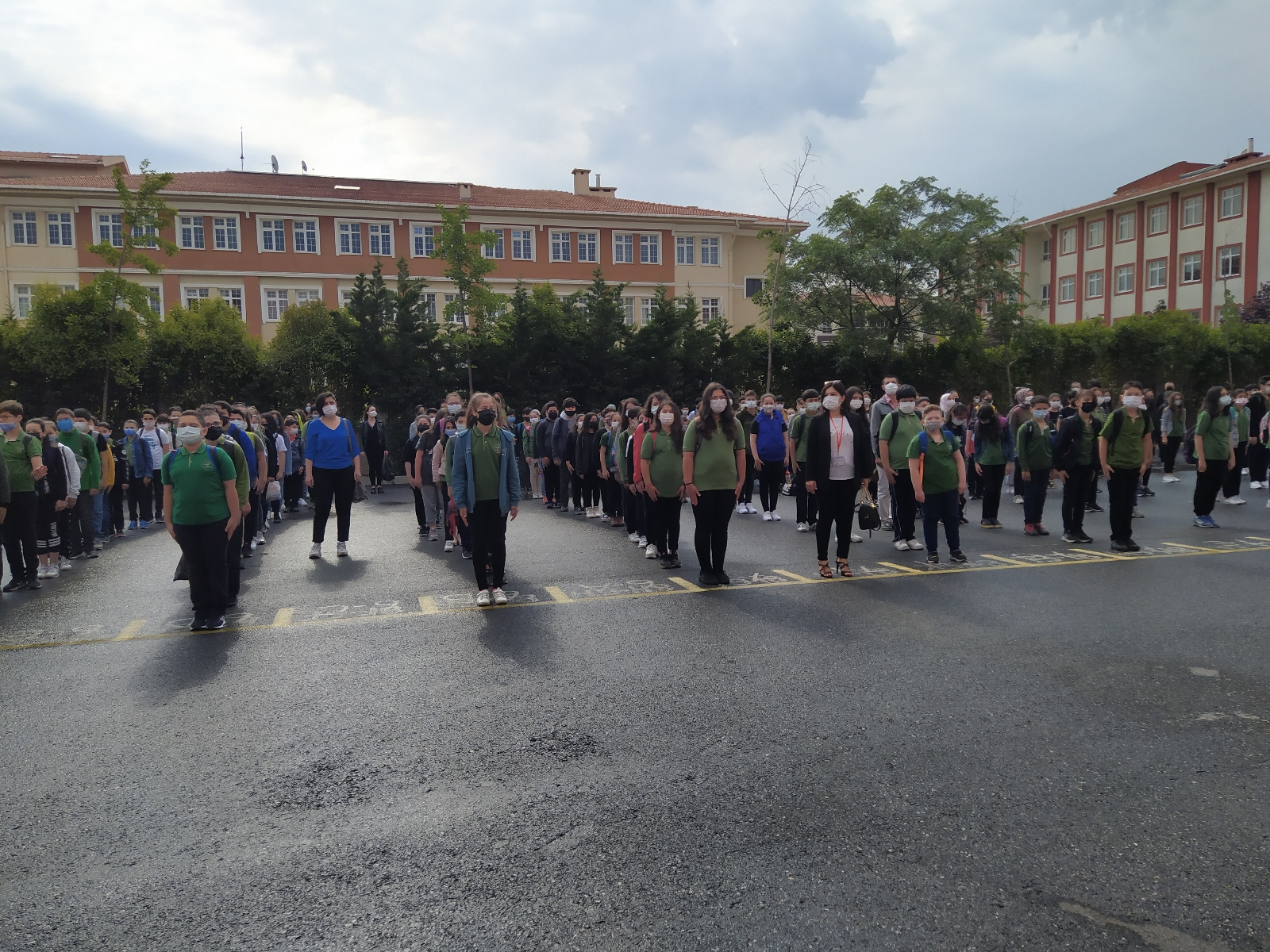 Bahçelievler-Yenibosna Fatih Ortaokulu’ndaki öğrenciler, isteğe bağlı katılımla haftada 2 gün, belirlenen koşullar doğrultusunda öğretmenlerine kavuştu. Öğrenciler, sosyal mesafe kurallarına uyarak sıraya girdi. Daha sonra tören düzenlendi, İstiklal Marşı okundu ve öğrenciler sırayla sınıflarına girdi.