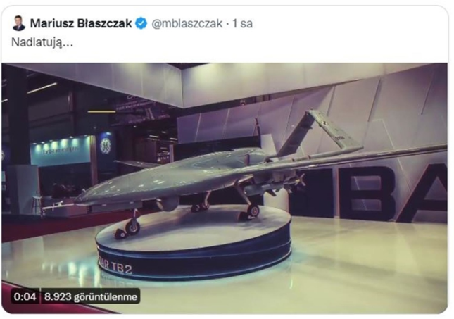 Polonya Savunma Bakanı Mariusz Blaszczak, Bayraktar insansız hava aracının videosuyla "Geliyorlar" mesajını paylaştı.