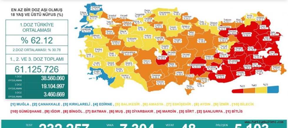 Aşı haritasında Hakkari'den sonra aşılamada yüzde 55 oranını aşarak, Gaziantep ve Konya da kırmızıdan turuncu kategoriye geçti.