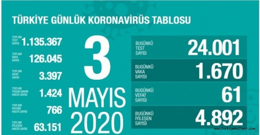Sağlık Bakanlığı, 24 saatte bir güncellediği Türkiye’deki günlük korona virüs tablosunu açıkladı. Tabloya göre, bugün 24 bin 1 test yapılırken, bin 670 kişinin testi pozitif çıktı. Son 24 saatte korona virüs dolayısıyla 61 kişi hayatını kaybederken, 4 bin 892 kişi iyileşerek taburcu oldu. Bugünkü sayılarla beraber Türkiye genelinde toplam test sayısı 1 milyon 135 bin 367’ye, toplam vaka sayısı 126 bin 45’e, toplam vefat sayısı 3 bin 397’ye, toplam yoğun bakım hasta sayısı bin 424’e ve toplam iyileşen hasta sayısı 63 bin 151’e yükselirken, bir önceki gün 778 olan toplam entübe hasta sayısı 766’ya geriledi.